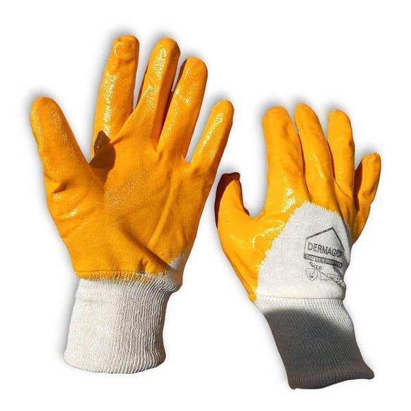 3/4 ладони перчаток покрыты желтым плотным нитрилом для более стойкой защиты рук от загрязнений и механических повреждений. При этом перчатки достаточно гибкие. Имеют вязанный манжет для фиксации на запястье.